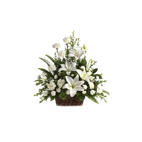 2 stems (6 pcs bud/ flower) white lily, 5 pcs white carnations & 6 pcs white gerbera in the basket. Send this amazing white basket to your loved ones for making his/her day more memorable.