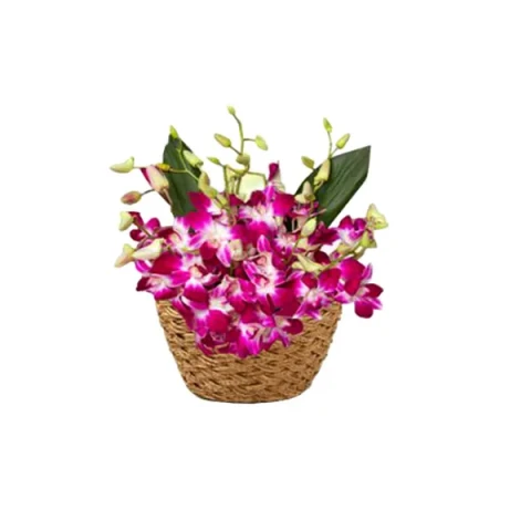 Purple orchids and green stuff in a basket.