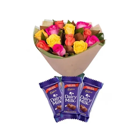 1 Dozen multicolor roses in a bouquet with 3 pcs Cadbury DAIRY MILK Chocolates.